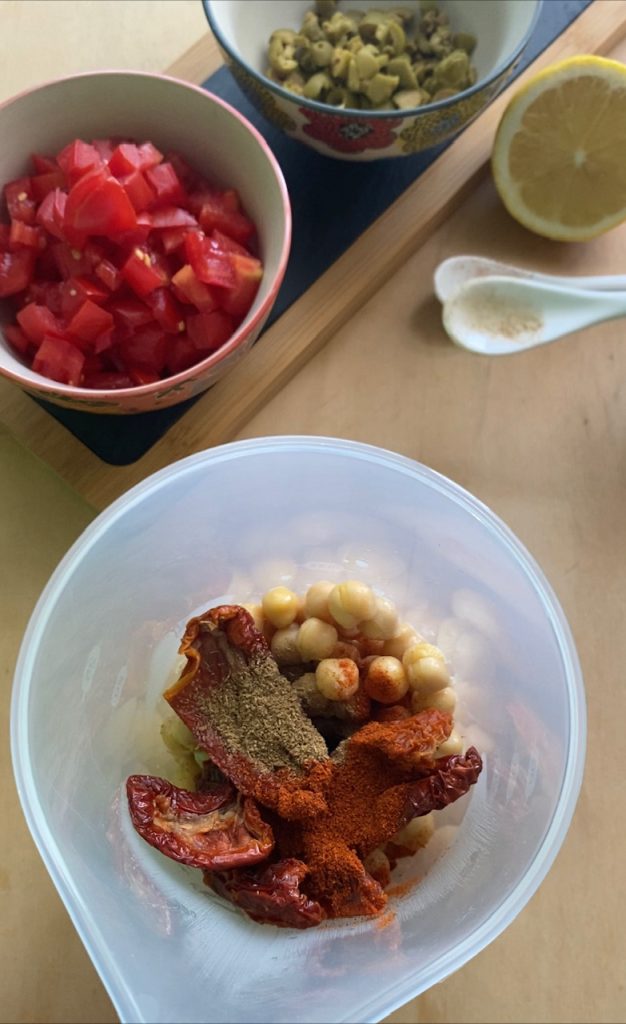 To prepare it, you will need sun-dried tomatoes, cherry tomatoes, chickpeas, olives, cumin, paprika, and lemon juice.