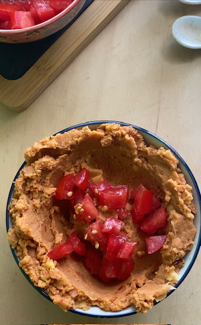 Mediterranean Hummus My Way with fresh tomatoes, the ideal summer starter.