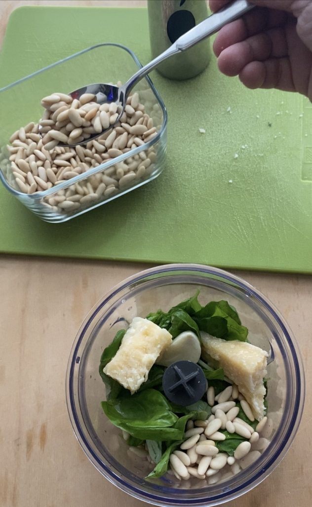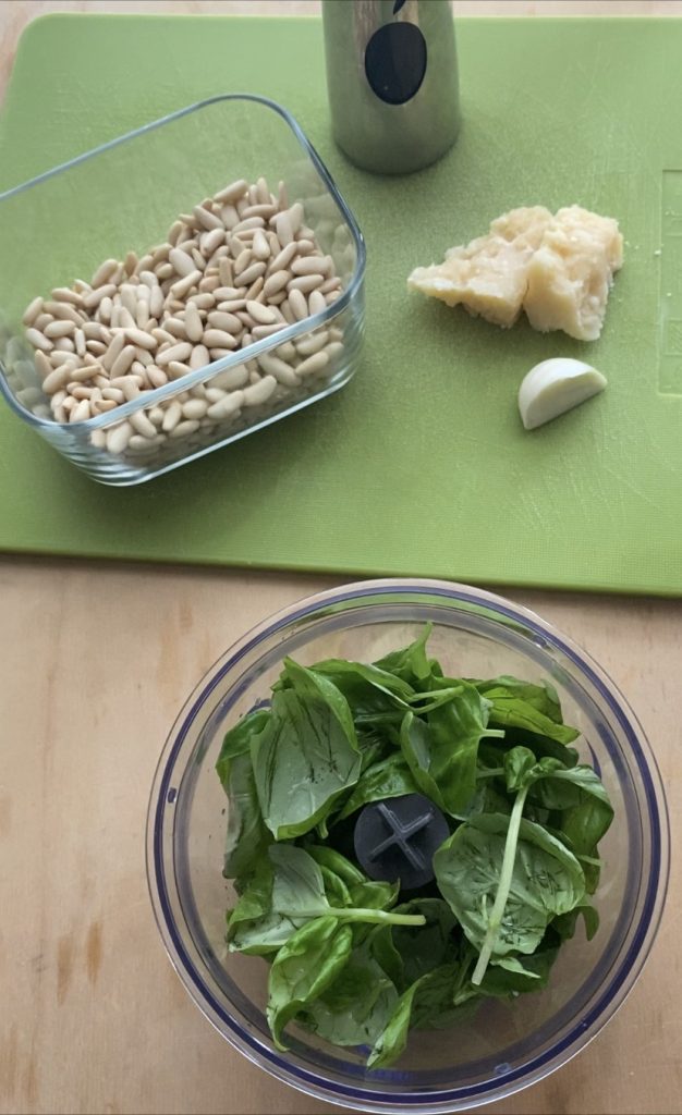 • First, I prepared the pesto (find the traditional recipe here) in this case, I didn’t use pecorino simply because I didn’t have it. 🙂