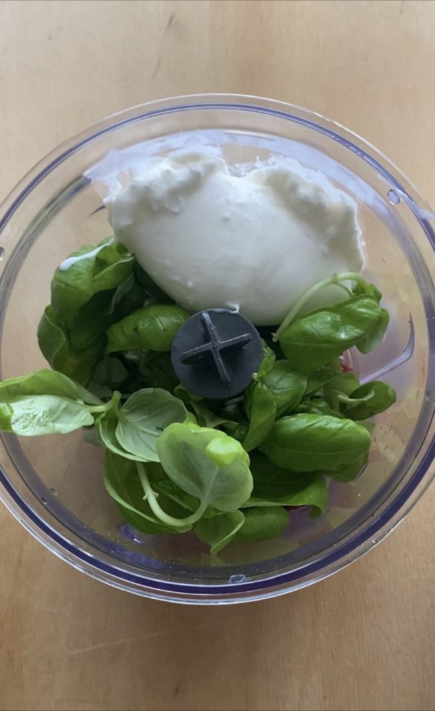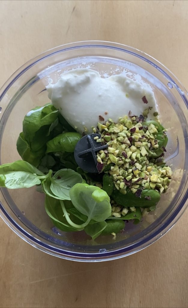 To prepare the pesto, I used basil, which can never be missing in my kitchen. I’m so obsessed that I grow it on my terrace 🙂 and pistachio crumble.