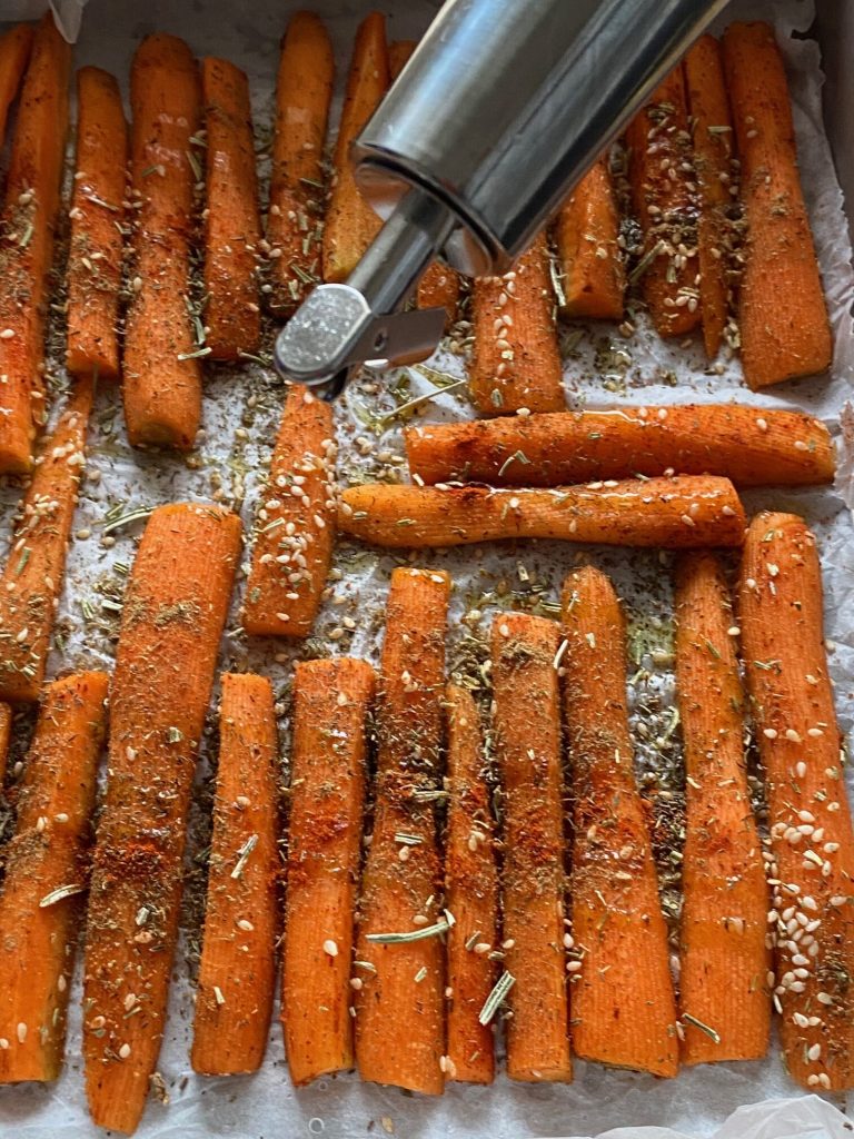 • If, like me, you don’t have a large oven, after cooking the carrots you will need to proceed with cooking the chickpeas by placing them in a baking sheet covered with parchment paper, seasoning them with paprika, a drizzle of extra virgin olive oil and cooking them for 30 minutes at 400°F. Remember not to blend them all but keep a tablespoon aside to garnish the dish.