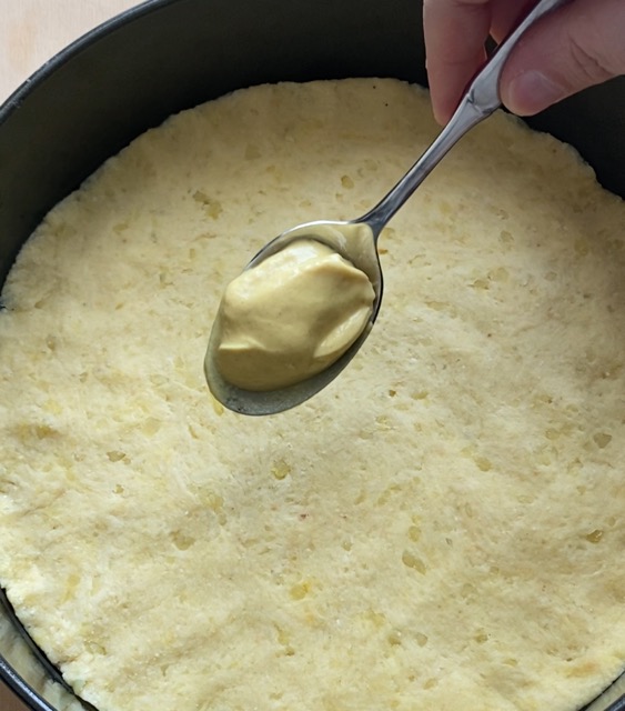 I used a 9.5 inch pie pan, greased, and with my hands, I used the dough to prepare the base of the pie, adding a teaspoon of mustard (optional).