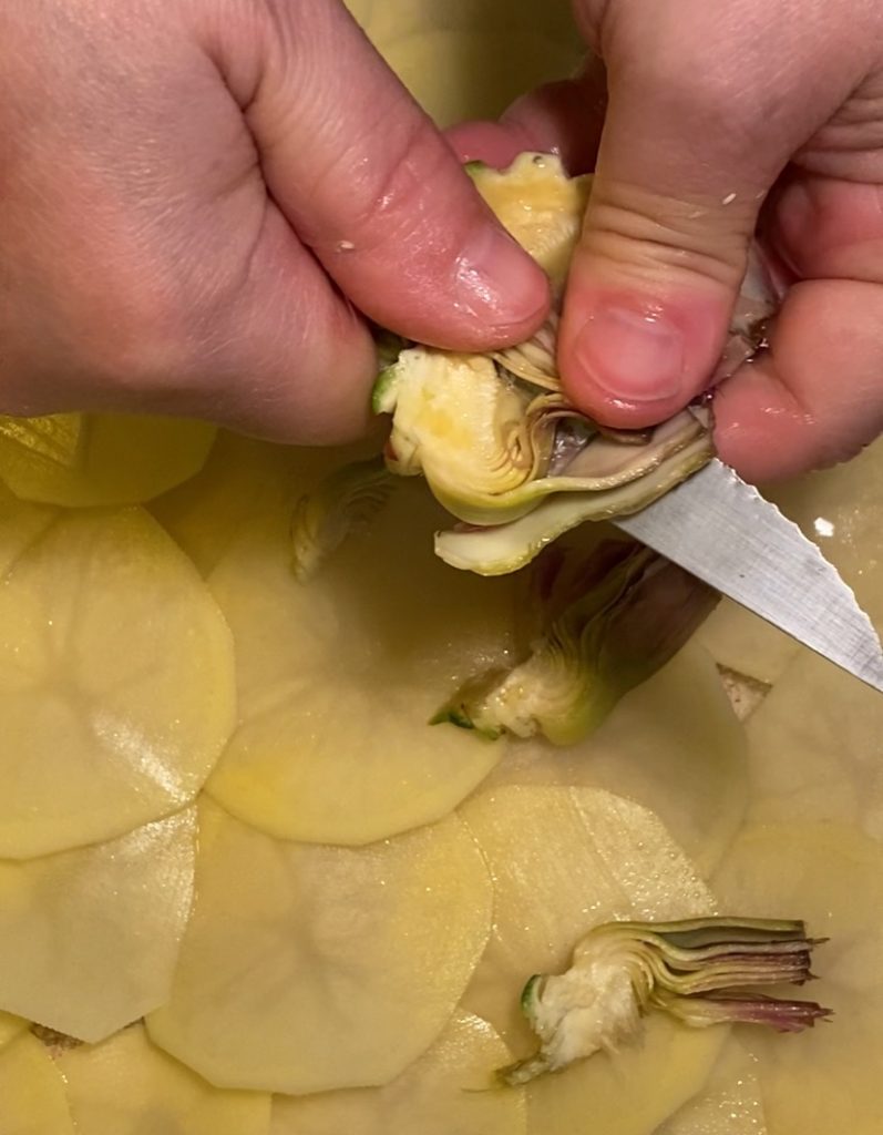 Add the artichoke slices and then another layer of potatoes.