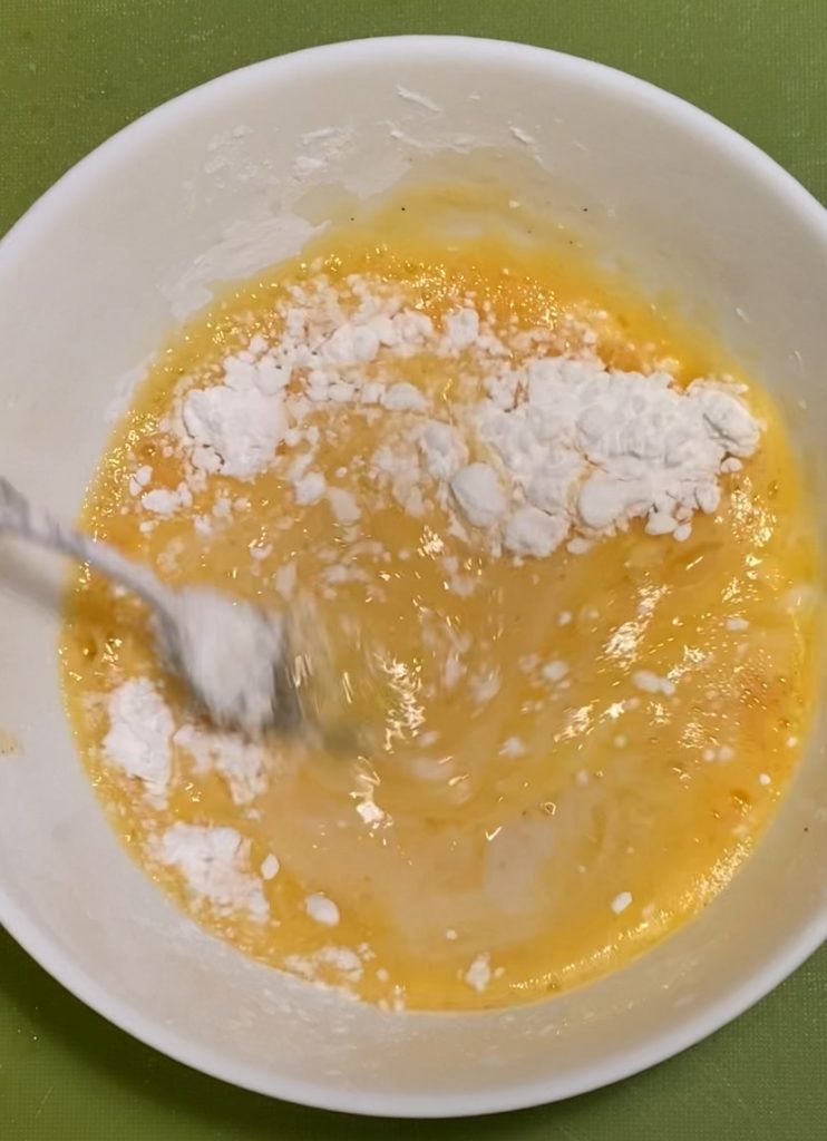 Add the flour and half a cup of milk (also plant-based) to the eggs.