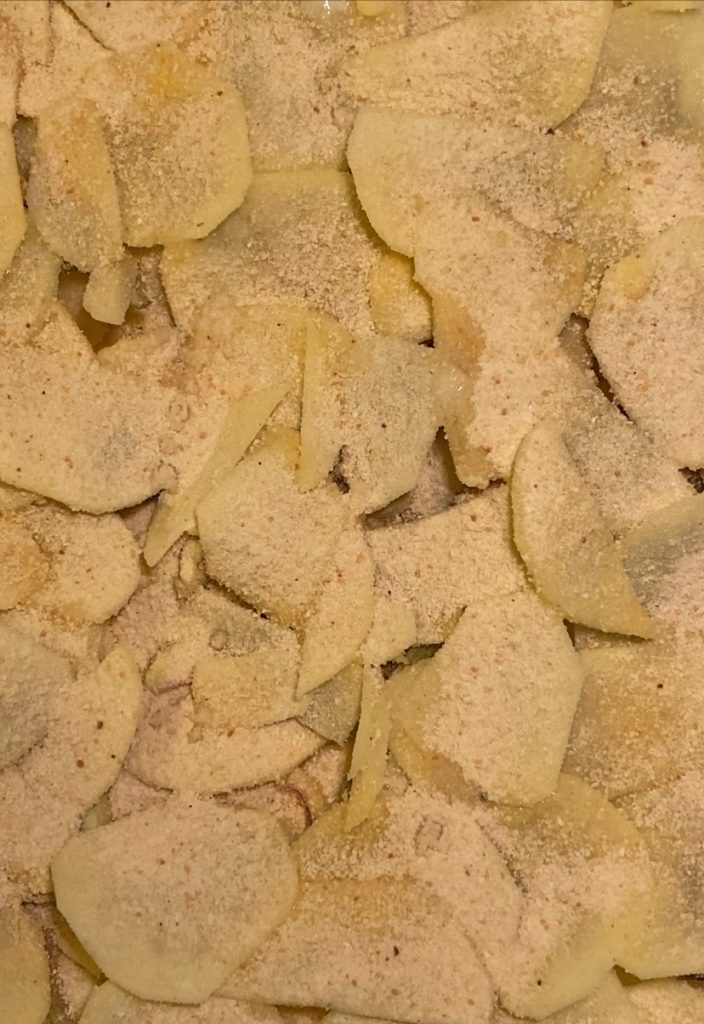 If you have a mandoline, you can slice the potatoes thinly. Remember, you should be able to see through the slice. If you don’t have a mandoline, I recommend parboiling the potatoes.