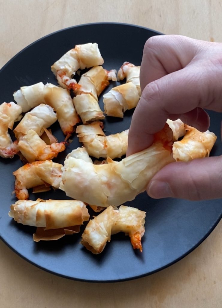 Shrimp rolls in phyllo dough cooked in an air fryer.