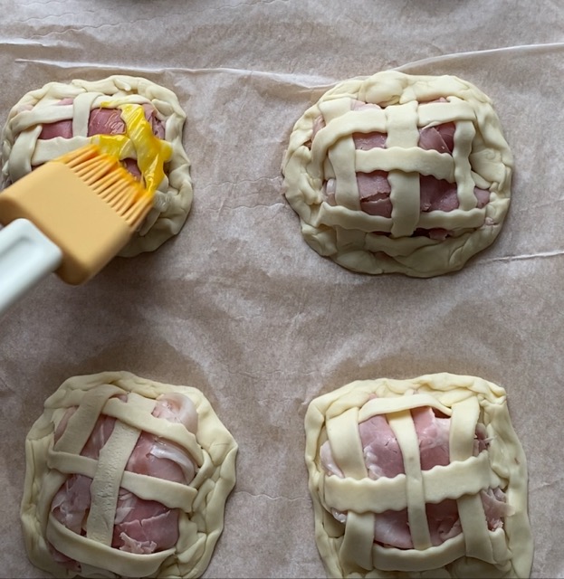 Brush with the egg yolk to make the puff pastry more golden. Bake at 350°F for about 30 minutes or until golden.