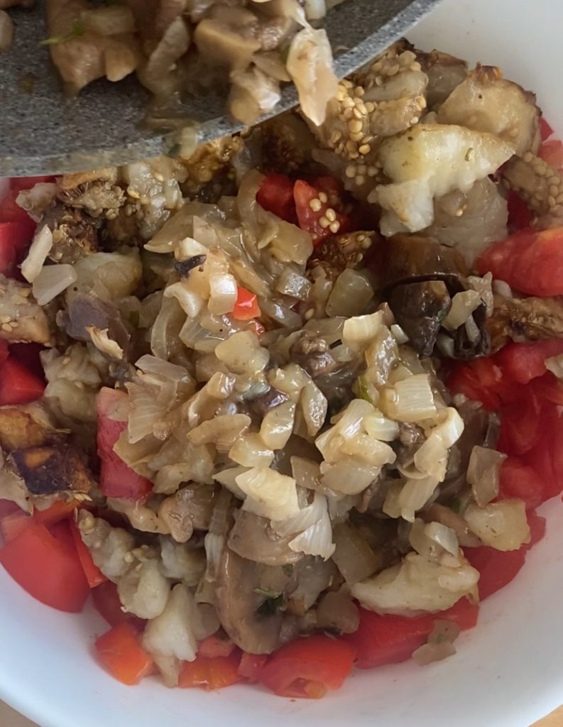 Add the sautéed mushrooms and tomatoes to the eggplant pulp, mix very well, allowing the flavors to blend.