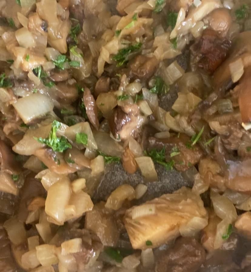 Meanwhile, cook the mixed mushrooms in a pan with a clove of garlic and parsley.