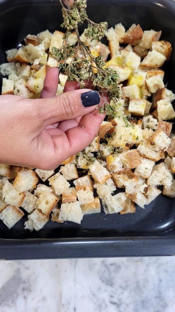 • Transfer the croutons to the air fryer and cook at 392°F for 7 minutes, shaking the basket a couple of times for even cooking