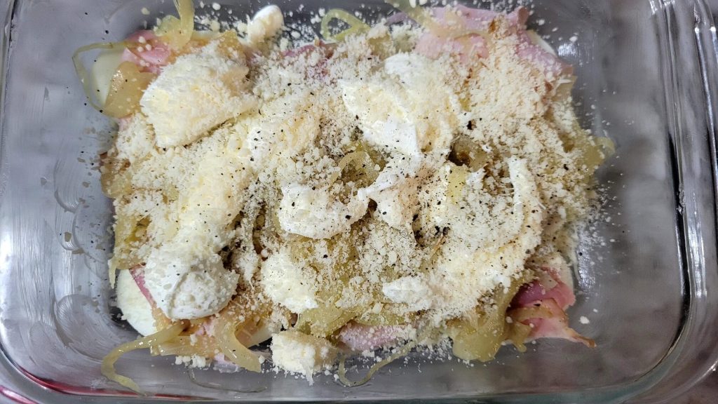 For the Air Fryer Egg Gratin, I also cooked the eggs in the air fryer, but if you prefer, use the traditional method. I enriched these eggs with sage-flavored onion, smoked ham, cooking cream, and Parmesan.