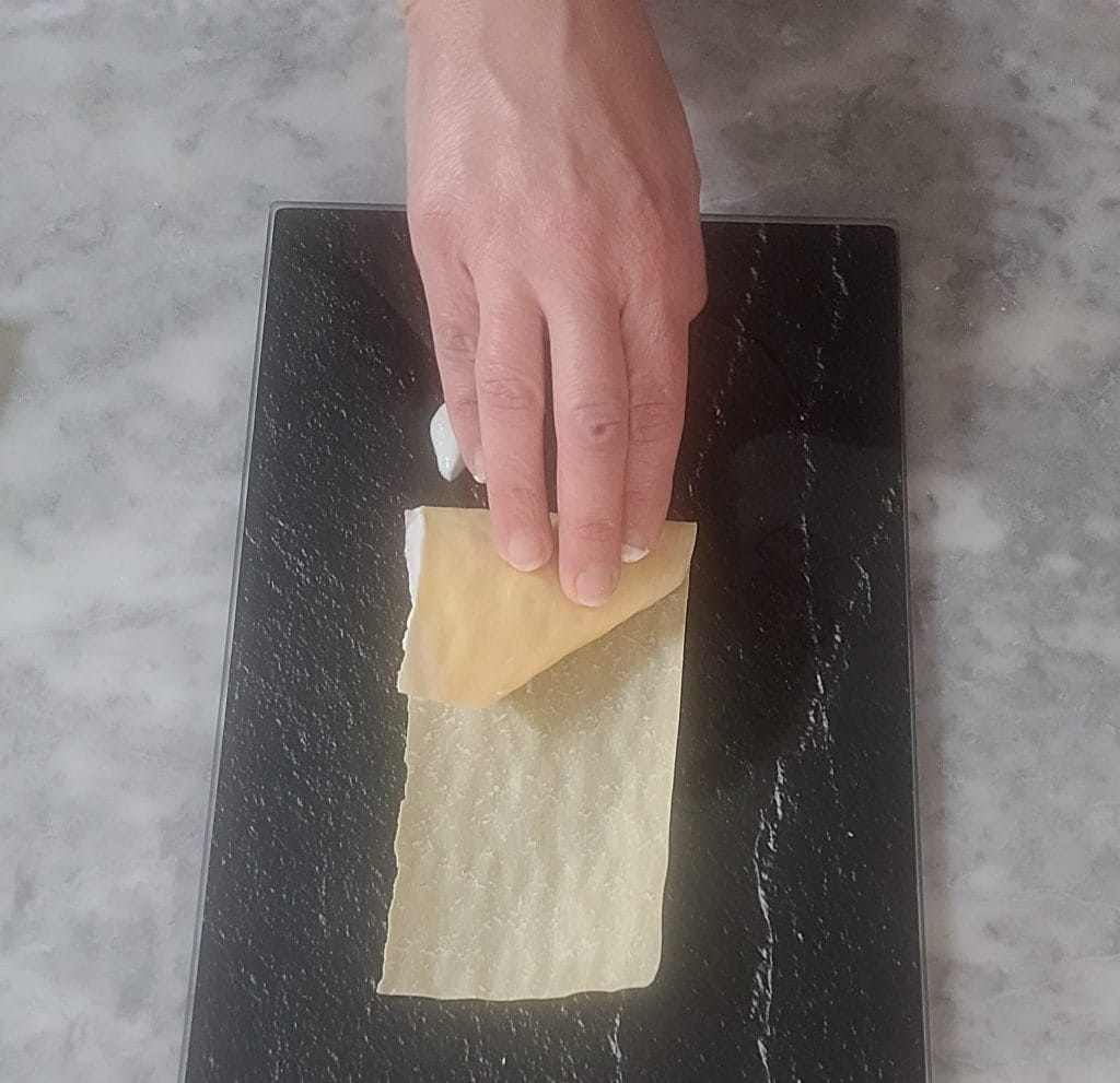 • Take a sheet folded in half lengthwise and divide it. Place a spoonful of robiola cream at the beginning of the rectangle