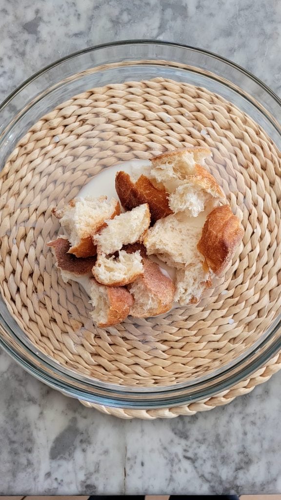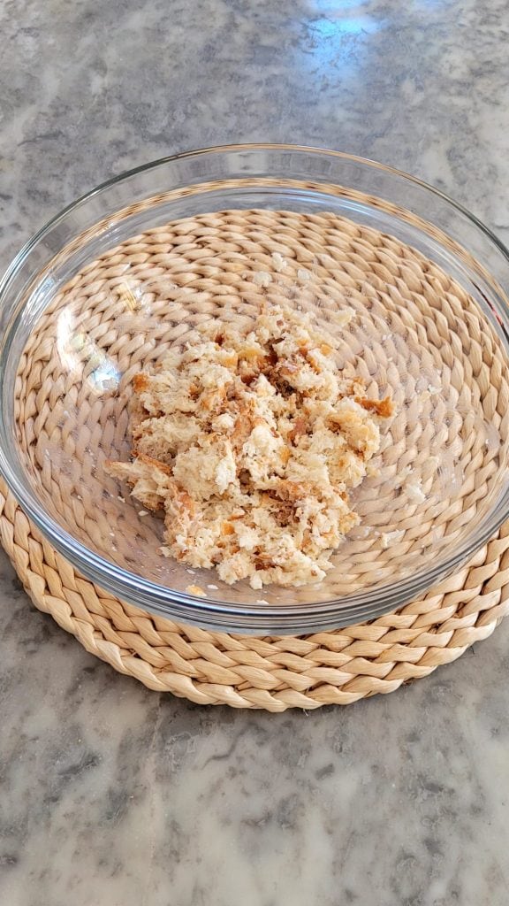 • In a bowl, soften the torn bread with milk, and let it sit for 10 minutes