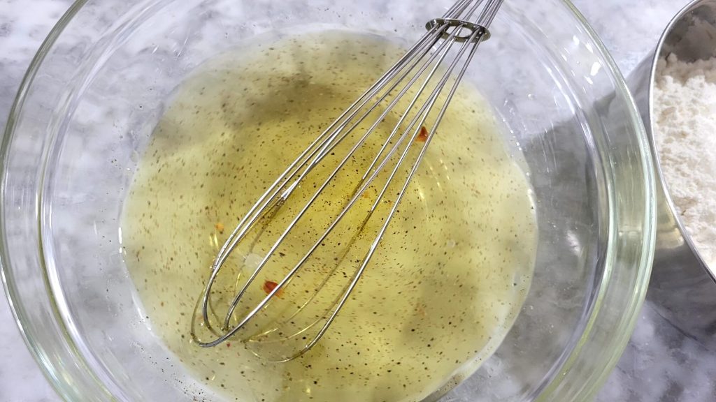 Pour the olive oil, water, salt, pepper, and chili (optional) into a bowl and mix