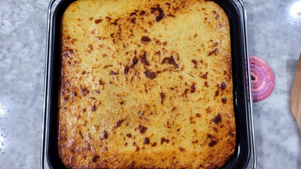 It is a dough that includes water, extra virgin olive oil, flour, salt, pepper, Grana Padano, grated potatoes, rosemary, and if you want, you can add a little chili pepper as I did. Mix everything in a bowl and immediately put it in the air fryer to cook. To get a well-cooked potato focaccia inside and an even and crispy cooking on both sides, the focaccia must be flipped towards the end of cooking. I did not use parchment paper in the pan, but if you want to make this operation easier, you can do it, increasing the cooking times compared to what I indicate in this recipe.