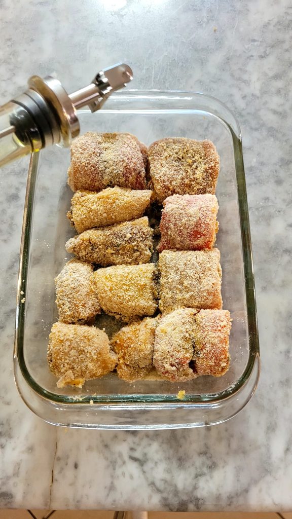 • As you bread them, place the rolls in a slightly greased baking dish. Drizzle with a bit of evo oil