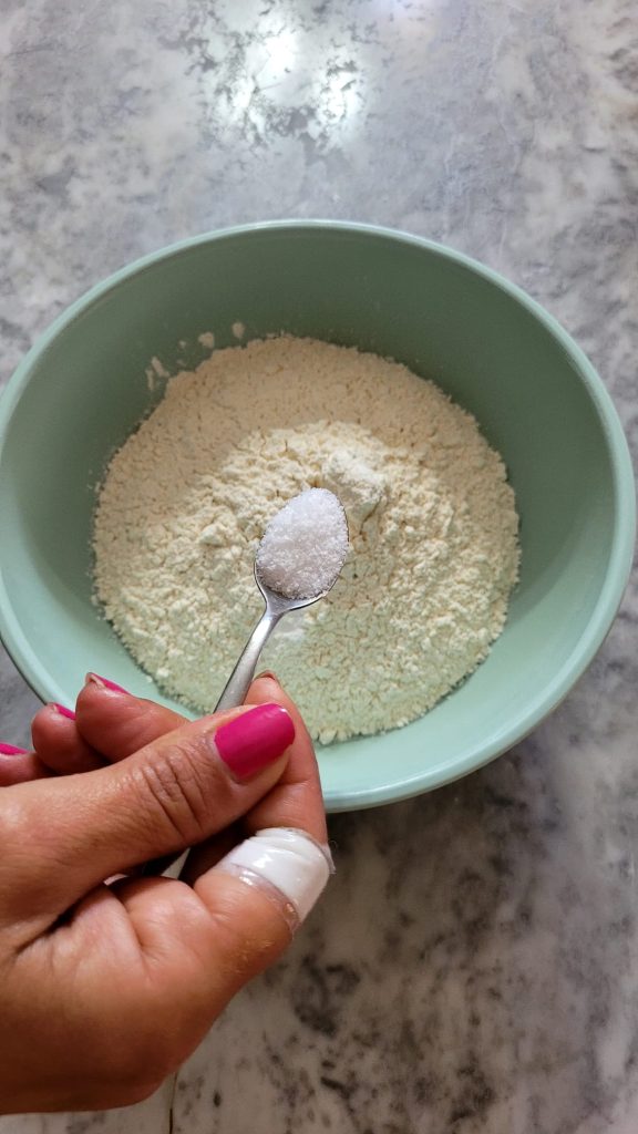 • In a bowl, pour the flour and add a teaspoon of baking soda