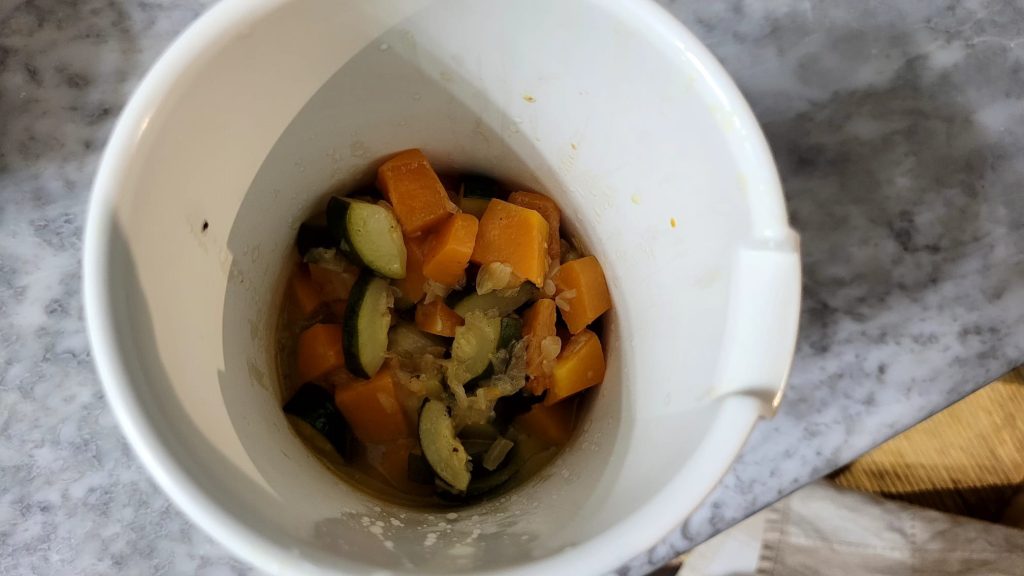 Once cooked, transfer them to a pitcher, add 2 ladles of cooking water and blend with the immersion blender. Adjust with salt and pepper.