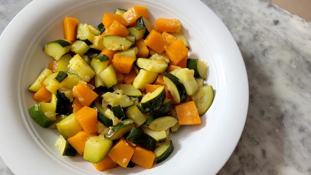 It’s pumpkin season, delicious and versatile, and with this first course, it has been paired with zucchini in two textures, one creamy and the other crunchier.