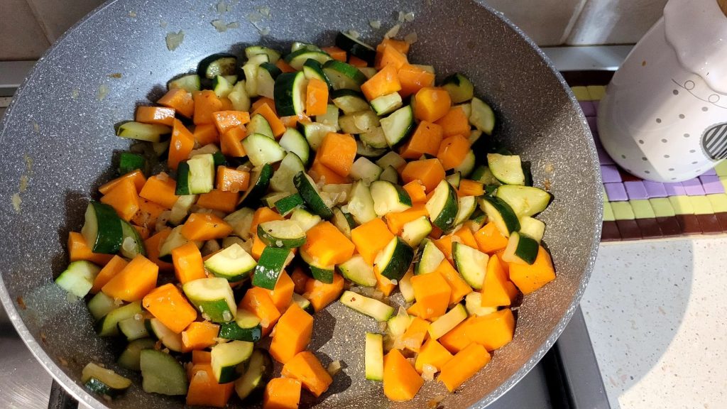 Cut the pumpkin and zucchini into chunks. Chop the onion and transfer it to a pan with a good swirl of oil and let it brown, add the zucchini and let them brown, deglaze with the white wine. Once the wine has completely evaporated, cook the zucchini over medium heat for 10 minutes.