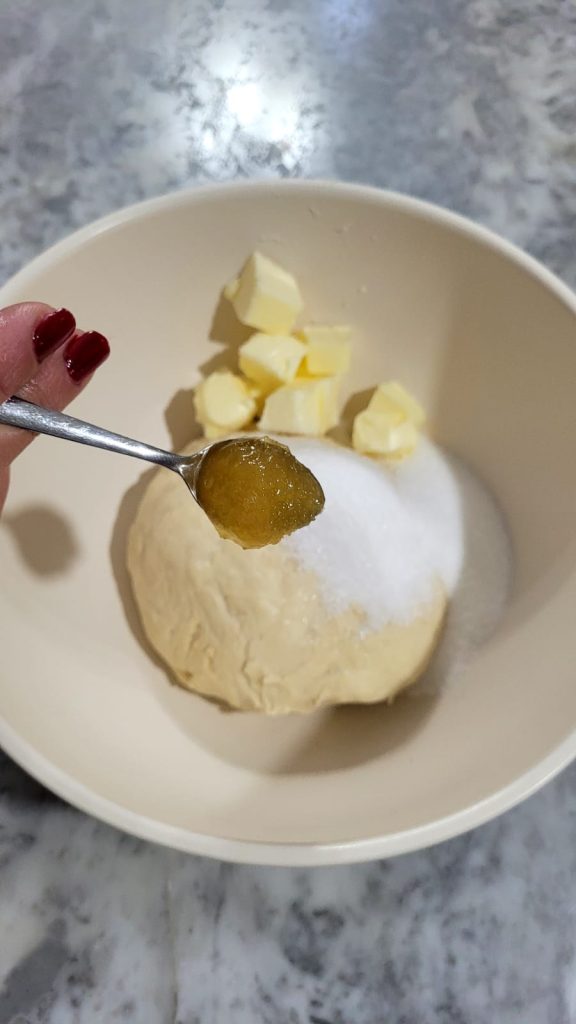 After the first rise, add the sugar, the softened butter cut into pieces, and a teaspoon of honey (I used wildflower honey)