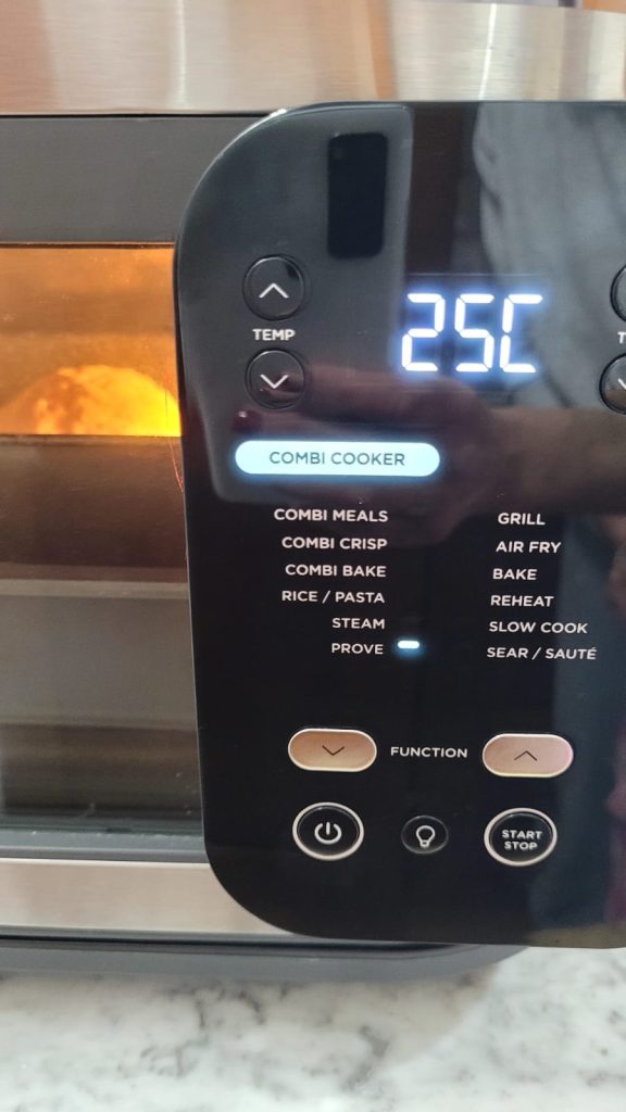 – in multicooker: place the dough in a baking dish. Pour 1 quart of water into the combi tray and place the dish with the dough on the grill. Set the switch to combi cooker (left) and select the proof program, set 77°F for 30 minutes (see photo n.4)