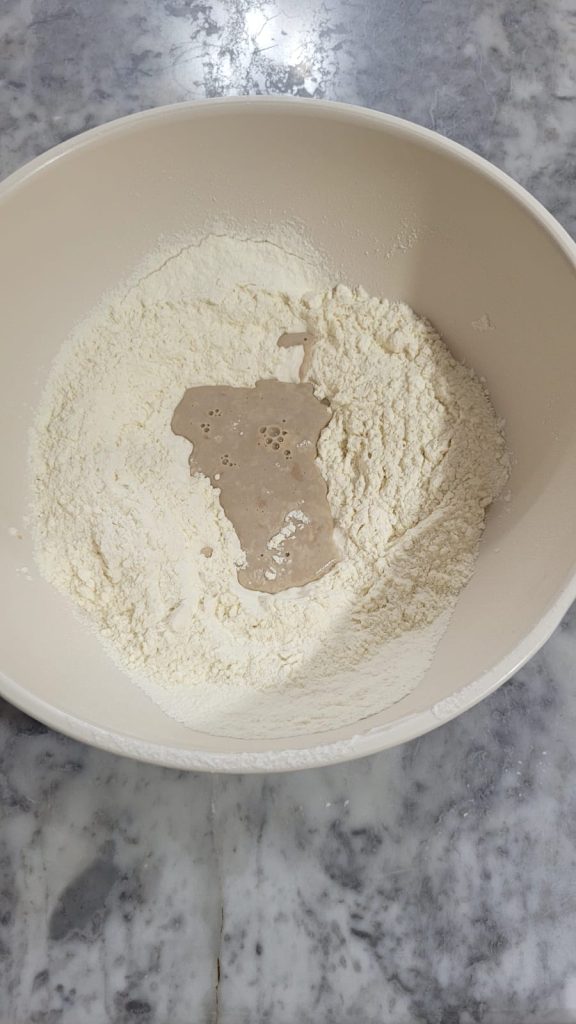 In a large bowl, sift 2 1/2 cups of flour and add both the fresh and natural yeast. If you choose to use dry yeast (as I did), activate it by dissolving it in a glass with a bit of water and a teaspoon of sugar, stir and let it rest for 5 minutes. After resting, add it to the flour