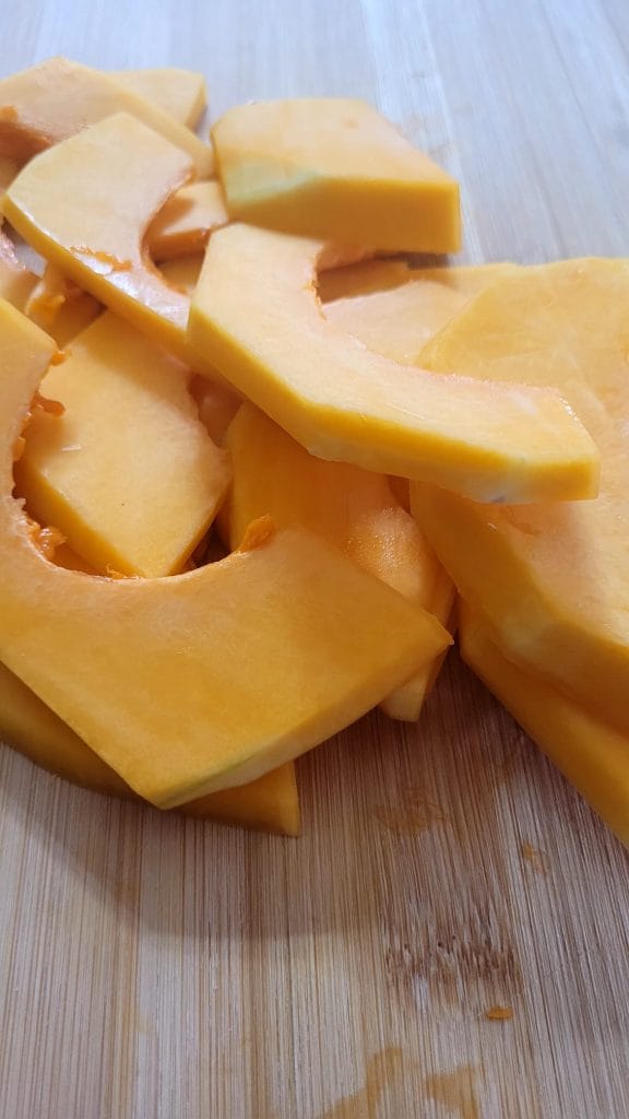 Cut the pumpkin into slices just over 1/4 inch thick, removing the skin and seeds