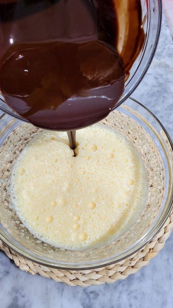 Pour the chocolate mix into the eggs and gently stir with a spatula from top to bottom to avoid deflating the mixture