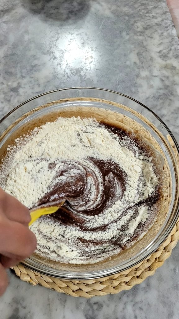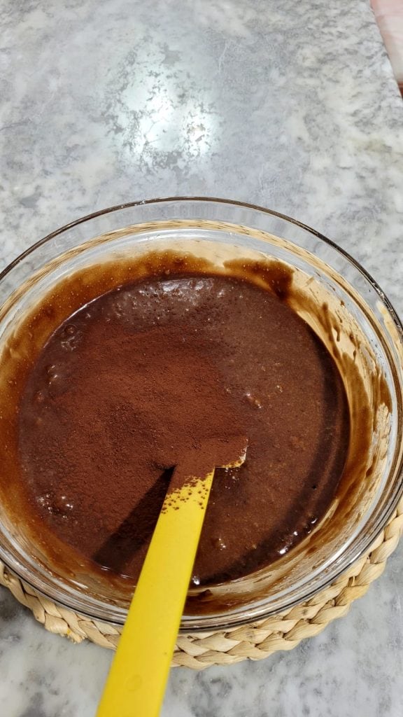 Mix the batter well with the spatula and add the cocoa, also sifted