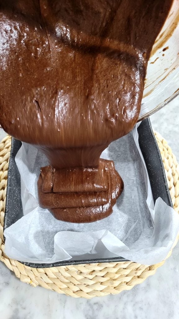 Pour the batter into the baking dish lined with previously buttered parchment paper