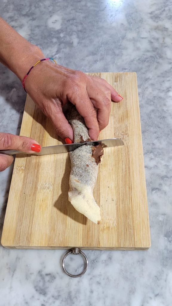 • Roll the cut side in the hazelnut crumbs; if they don’t stick, you can add a thin layer of Nutella on the end, then roll in the crumbs