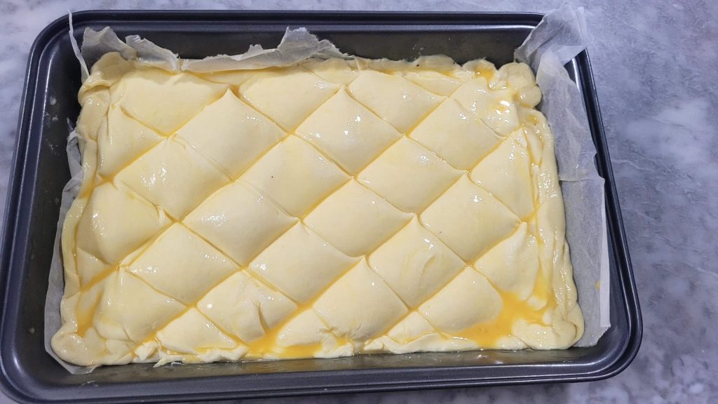 To prepare this recipe, I used a rectangular pastry, which I cut in half and filled with a stuffing of cheeses blended together with potatoes and egg.