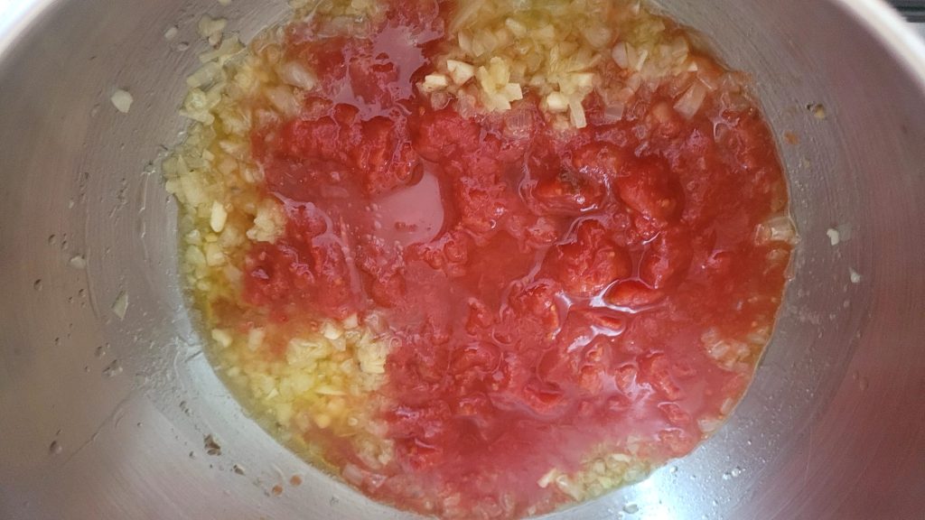 • Once the onion is golden and the anchovies are completely dissolved, add the tomato sauce and cook for 5 minutes.
