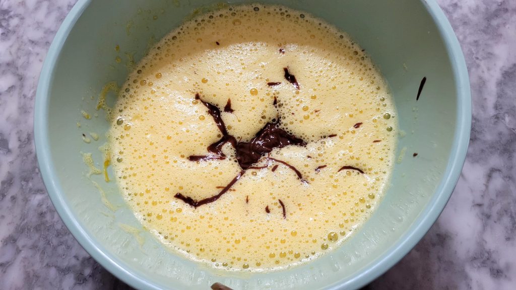 Re-whisk the eggs for a minute and combine the chocolate with the egg mixture.
