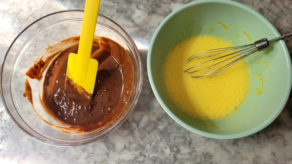 Here is the melted chocolate (let it cool for a few minutes) and the whipped eggs