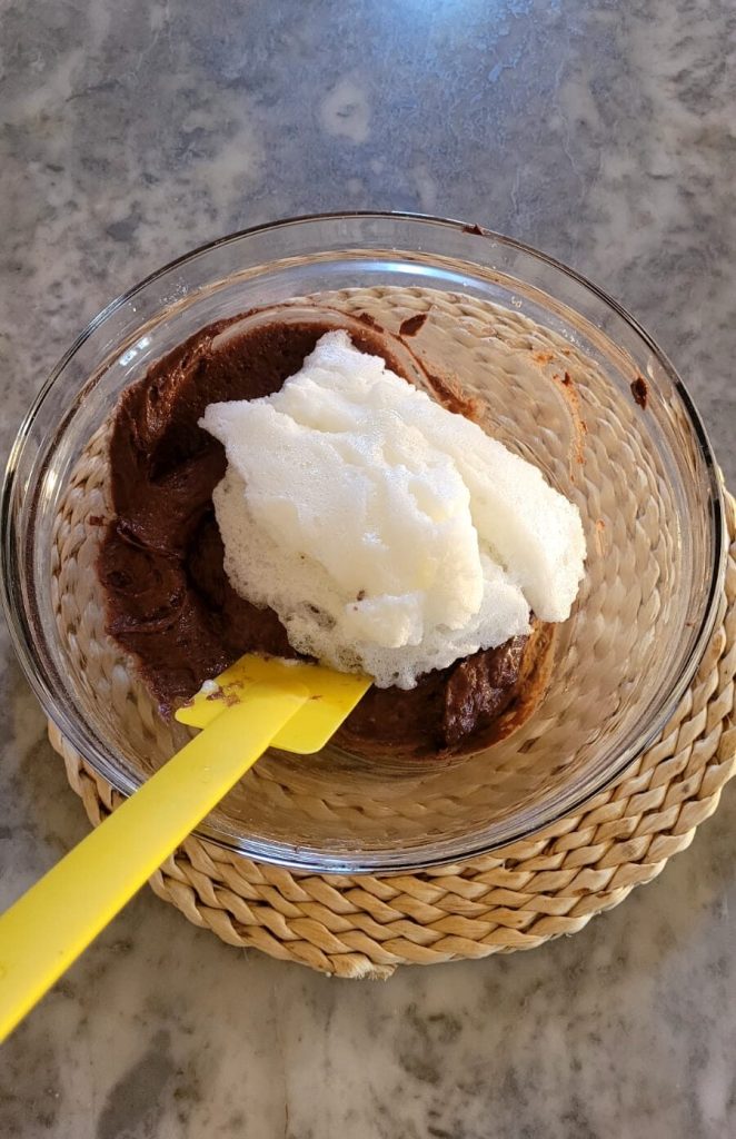• Now fold in the semi-whipped egg whites gently with a spatula or spoon, using upward strokes.