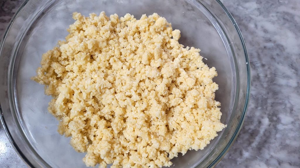 • In a bowl, add all the ingredients except the butter, and work them with your hands until you get a sandy texture