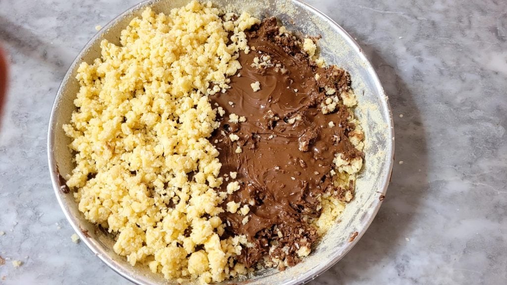 • Add the Nutella and spread it covering the mixture, using a spatula or the back of a spoon. Cover with the remaining crumbled dough