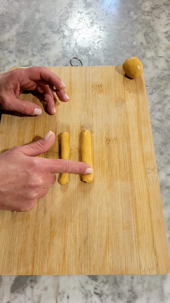 After resting time, remove the cling film and divide the dough into pieces — I used portions of about 1 oz (30 g) each. On a work surface, roll out two ropes of the same thickness and press a groove into one of them with your finger.