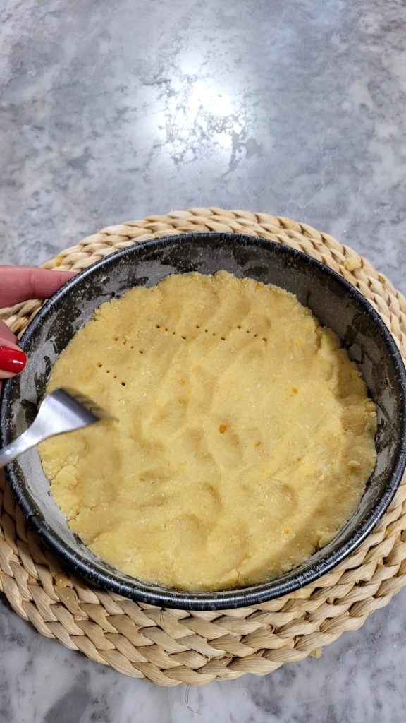Butter and flour the mold and line the base with half of the dough: press and join the crumbs with your hands, creating a compact shortcrust pastry and rising slightly on the edges. Prick the bottom with the tines of a fork.