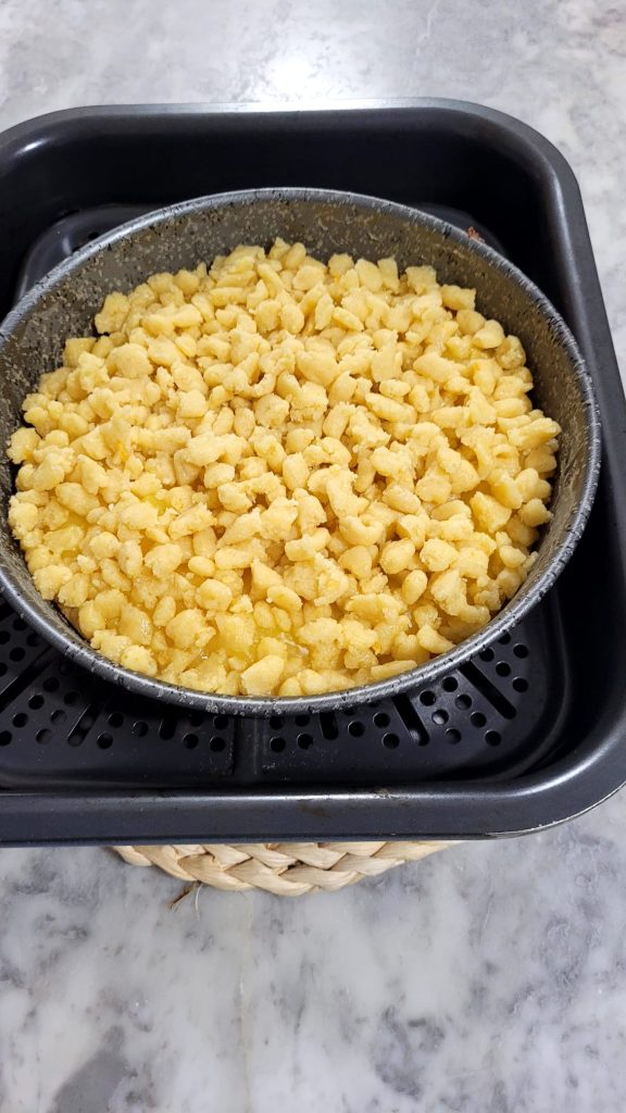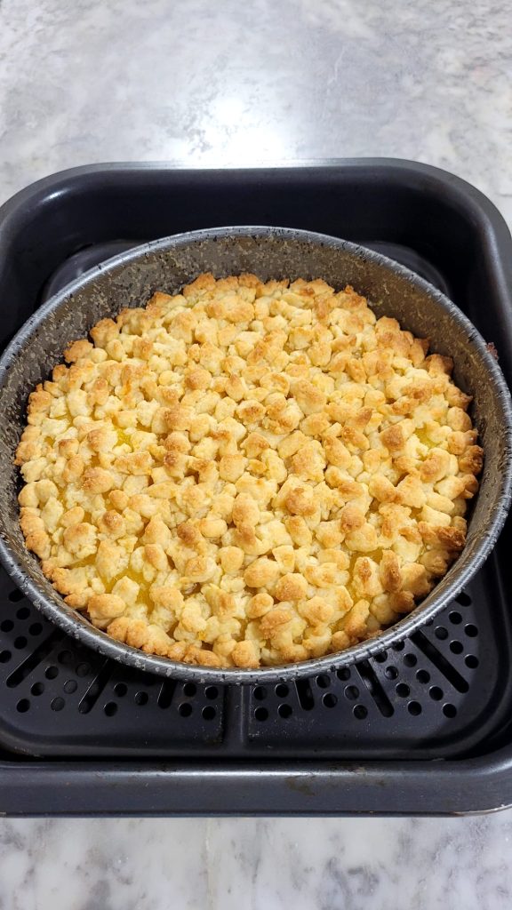 In this recipe, I chose to bake the base plain first, then add the cream and crumbled shortcrust pastry, completing the baking afterwards. With this step, the cream will remain softer, without drying out, and the base will be perfectly cooked: an ideal solution especially for those using a air fryer with single resistance and have difficulty cooking desserts evenly, even at the bottom.