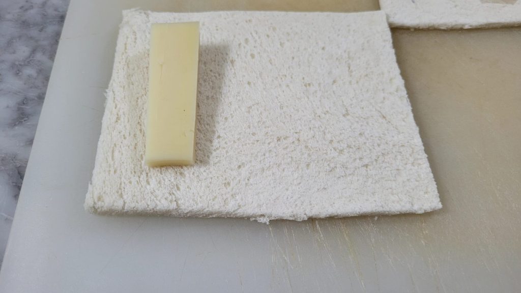 • First, flatten the slice of sandwich or white bread with the rolling pin on a work surface