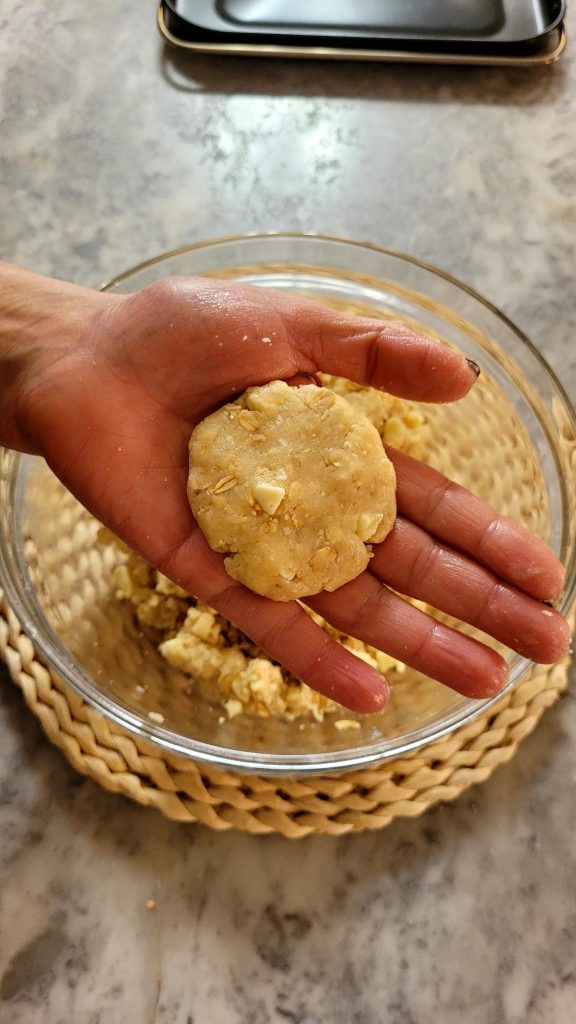 The dough will be crumbly, but don’t worry, you will be able to form the cookies without any difficulty.