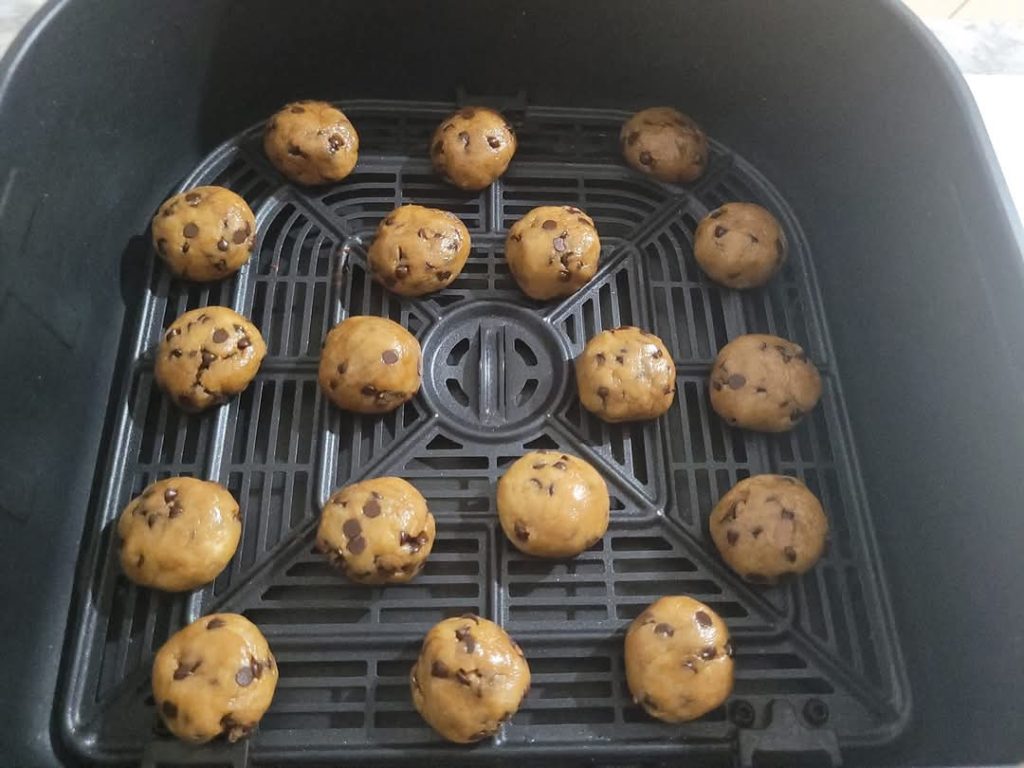 Preheat the air fryer for a couple of minutes. Place the cookies spaced apart on the air fryer rack, as they will flatten during cooking. Cook at 340°F (170°C) for 10-12 minutes