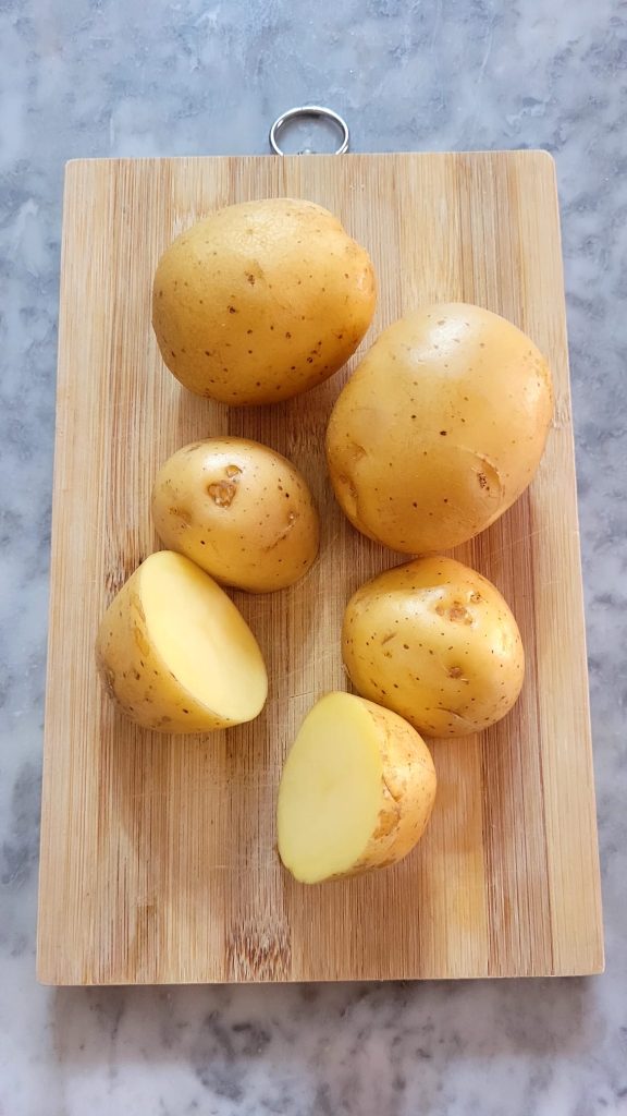 Wash the potatoes thoroughly to remove any soil. Cut them in half