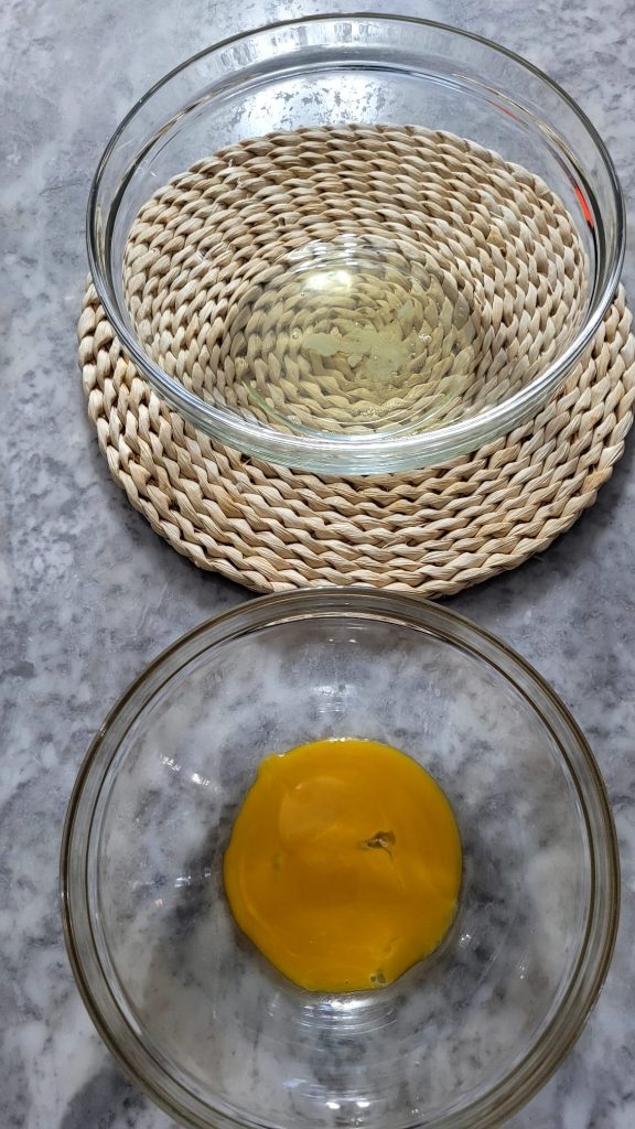 Take two bowls, break the eggs, and separate the yolks from the whites