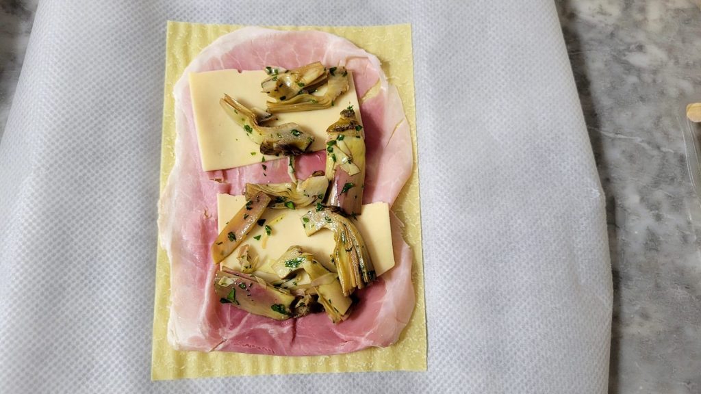 On a work surface, take the lasagna sheet and fill it with 1 or 2 slices of cooked ham, 1 slice of cheese, and finish with the artichokes