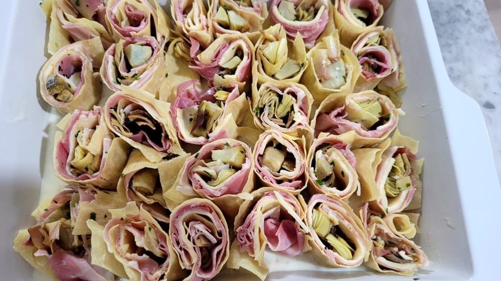 Lasagna Roses in Air Fryer are a unique first course, with a crispy surface and a softer, creamier base. I thought of stuffing these with cooked ham, cheese, and artichokes, all covered with béchamel sauce. I blanched the artichokes in water and vinegar, leaving them slightly crunchy, simply seasoned with olive oil, parsley, and salt, to get closer to the taste of those in oil, so if you don’t have time to prepare them, you can use the jarred ones. I used thin, fresh lasagna sheets and sliced gouda cheese, which you can replace with mild provola.