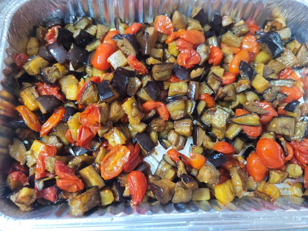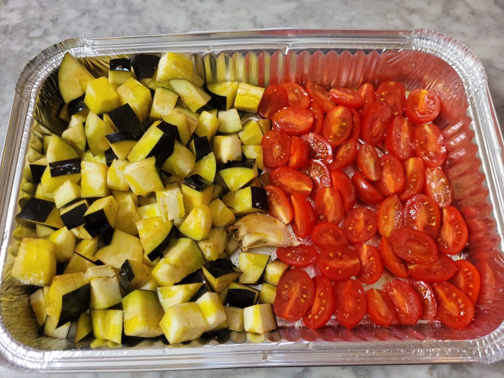 • After washing the eggplants and tomatoes, cut the eggplants into chunks and the tomatoes in half, transfer them to a baking dish, and season with oil, salt, and a clove of garlic in its skin. The tomatoes should be placed with the cut side up. Bake at 350°F for 30 minutes.